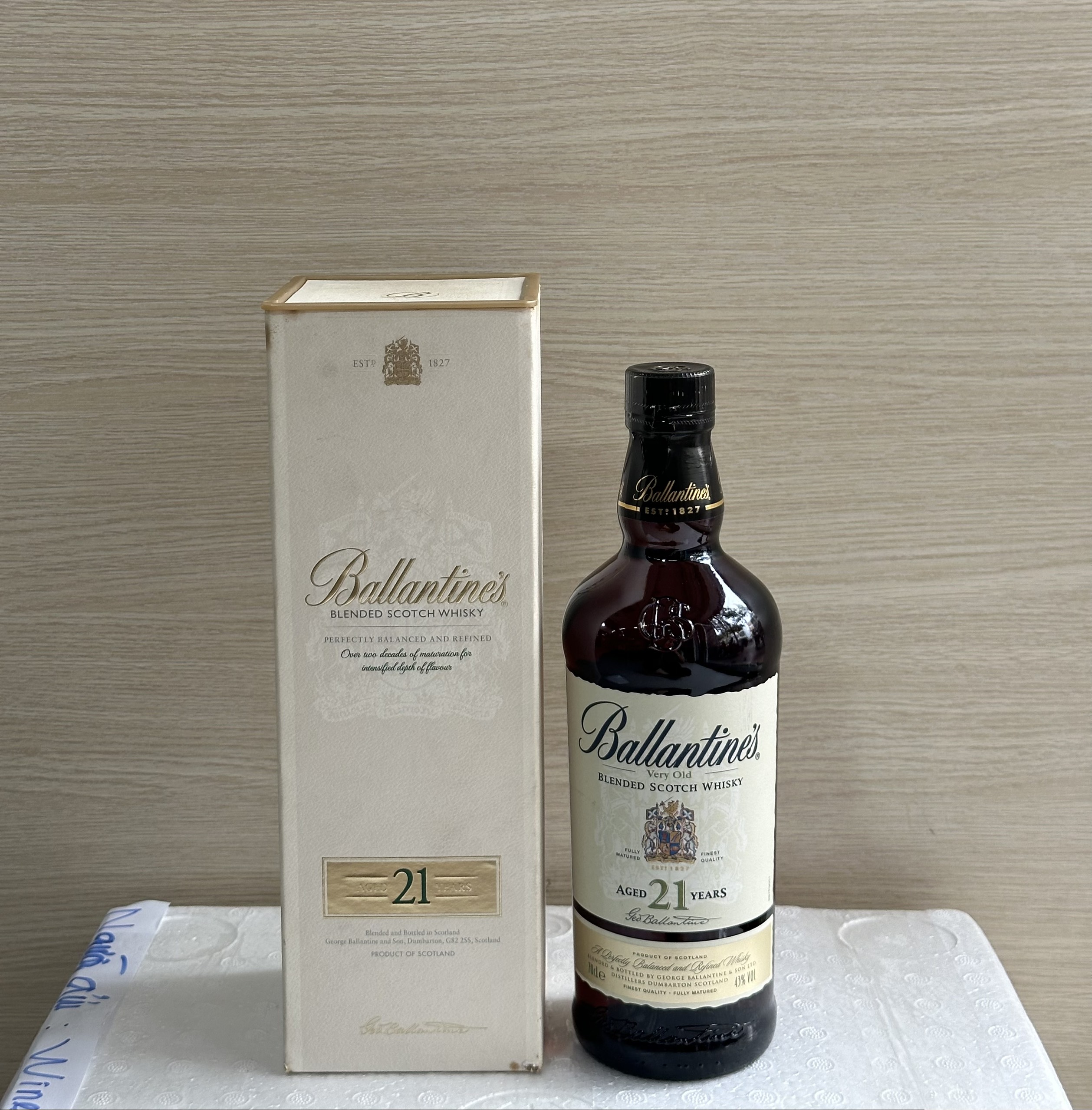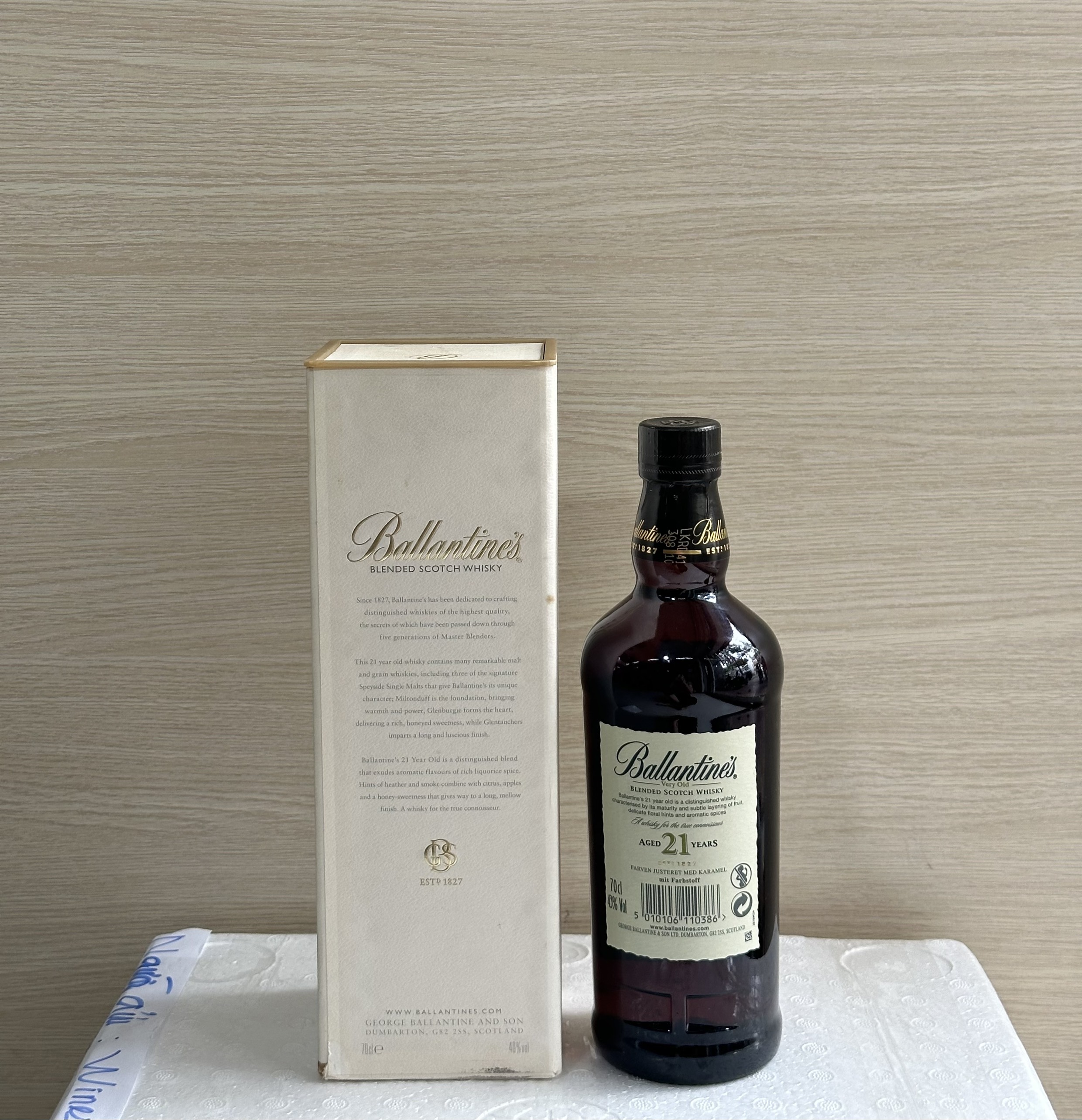 Rượu Ballantine's 21 năm – Ballantine 21 years old là loại whisky từ Scotland với hương vị phức cảm, nguyên chất và thanh lịch. Nó được xem như một loại hương vị có thể làm hài lòng những ai có phong cách sống hiện đại. Màu vàng nhạt mang hương vị tuyệt vời không một chút sai sót là kết quả của một quá trình pha trộn phức tạp từ mạch nha và ngũ cốc được lựa chọn kỹ lưỡng được ủ trong ít nhất là 3 năm hoặc lâu hơn nữa. Mùi hương đặc trưng của mạnh nha vùng Miltonduff và Glenburgie mang đến cho rượu Ballantine's 21 năm mùi hương sôcôla, táo đỏ và vani thật khác biệt.