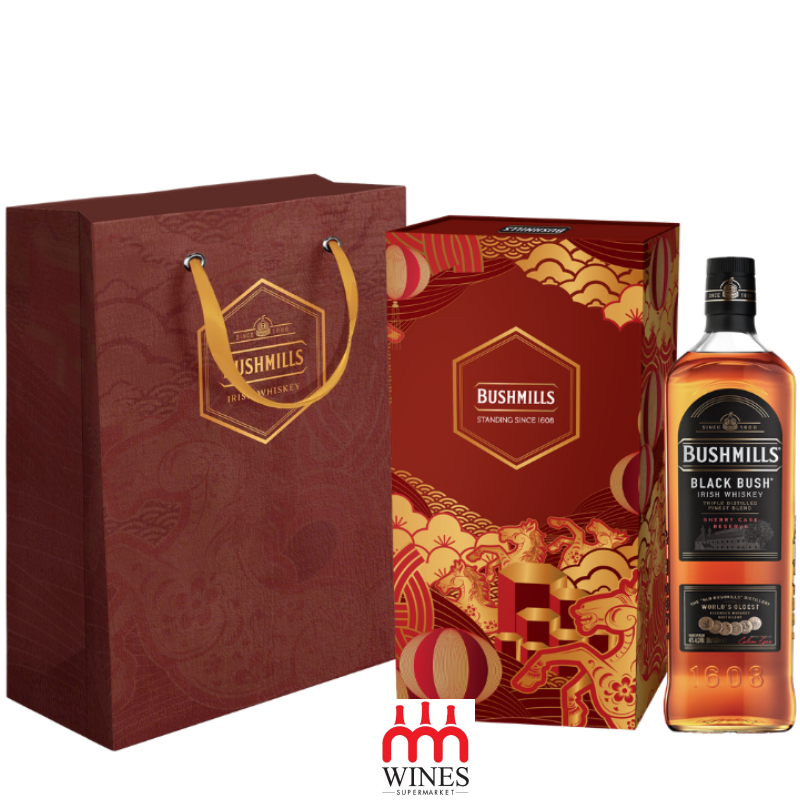 Phiên bản Bushmills Black Bush Hộp Quà Tết 2026 được trình bày trong chai thủy tinh đậm màu amber, với nhãn đen sang trọng khắc tên “Black Bush” nổi bật biểu tượng của sự mạnh mẽ và tinh tế. Hộp quà Tết thiết kế hiện đại với màu đỏ và vàng đồng chủ đạo, mang phong cách Ireland cổ điển hòa quyện tinh thần năm mới vừa đẳng cấp, vừa ý nghĩa khi dùng làm quà biếu đối tác, người thân.