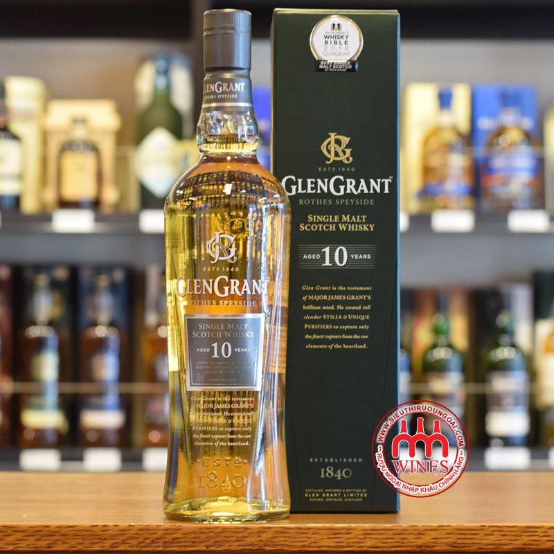 Nhà máy chưng cất Glen Grant, được thành lập vào năm 1840, là một phần của 'Đường mòn Malt Whisky' nổi tiếng của Scotland trên Speyside. 10 năm tuổi này có màu lúa mạch vàng đậm đà với mũi khô vừa và cung cấp một khẩu vị trái cây sạch sẽ với một kết thúc dài, tinh tế, bổ dưỡng.