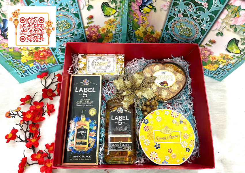 Bộ Hộp Quà Tết 02HQ25-001 gồm: - 1 Rượu Label 5 Classic Black 750ml - 1 Bánh quy Reina Gold - Vàng 126g - 1 Kẹo Chocolate Golden trái tim - Vàng 75g - 1 Trà Carish Natural Tea Leaves - Vàng 100g - 1 Hộp Quà Cao Cấp + Phụ kiện + Túi xách ------------------------------------------------------------ |