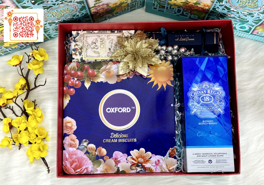 Bộ Hộp Quà Tết 02HQ25-002 gồm: -1 Chivas 18 năm (YO) Blue Signature 700ml - 1 Hộp Bánh Oxford Delicious Cream - 1 Biscuits xanh 420g - 1 Trà Carish Natural Tea Leaves - Xanh 100g - 1 Kẹo Toffees nơ xanh 50g - 1 Hộp Quà Cao Cấp + Phụ kiện + Túi xách ------------------------------------------------------