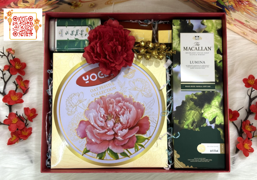 Bộ Hộp Quà Tết 02HQ25-005 gồm: - 1 Rượu The Macallan Lumina 700ml - 1 Bánh Yogee Oat Festive Collection 308g - 1 Hộp Trà Ô Long Thượng Hạng 100g - 1 Kẹo Toffees nơ vàng 50g - Hộp Quà Cao Cấp + Phụ kiện + Túi ---------------------------------------------------------------------------- |