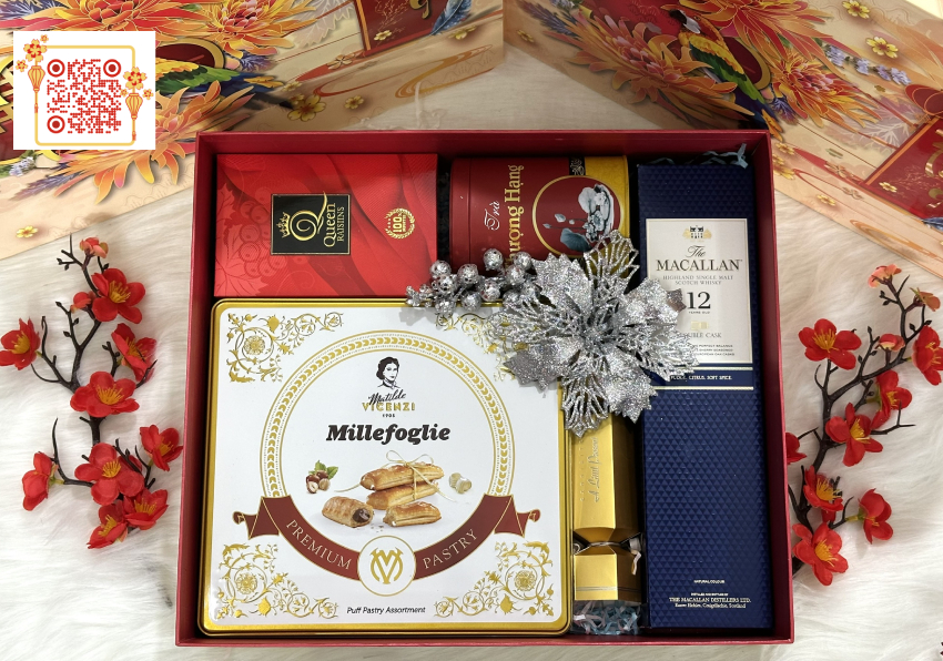 Bộ Hộp Quà Tết 02HQ25-006 gồm: - 1 Rượu The Macallan 12Y Double Cask 700ml - 1 Bánh Ngàn Lớp Vicenzi Millefoglie 250g - 1 Nho khô Queen Raisin - Đỏ 100g - 1 Hộp Trà Ô Long Thượng Hạng 50g - 1 Kẹo Toffees nơ vàng 50g - 1 Hộp Quà Cao Cấp + Túi xách --------------------------------------------- |