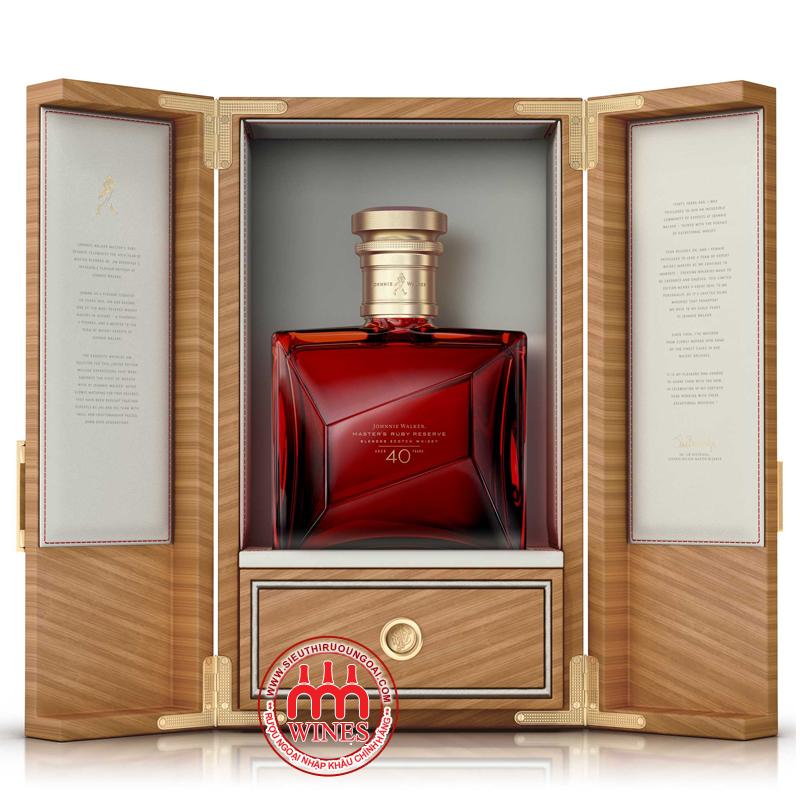 Được đóng chai với số lượng cực kì giới hạn, chỉ 398 chai trên toàn thế giới, Johnnie Walker Master’s Ruby Reserve 40 Y.O là phiên bản đánh dấu hành trình bốn thập kỷ bậc thầy phối trộn Jim Beveridge đồng hành cùng thương hiệu whisky danh tiếng. Chất vị Scotch whisky 40 năm tuổi là sự hòa quyện tinh tế của 8 dòng whisky quý hiếm do chính Jim Beveridge chọn lựa từ hơn 10 triệu thùng ủ, bao gồm cả những chất vị đến từ các nhà chưng cất huyền thoại
