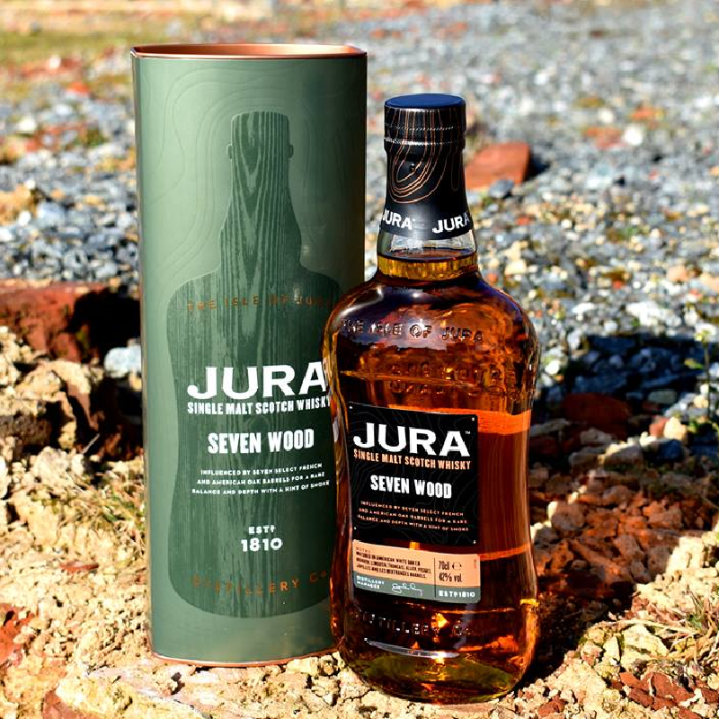 Isle of Jura Seven Wood lấy tên từ bảy loại cây sồi khác nhau được chế tác, giúp tạo ra hương vị đa tầng. Đó là loại rượu whisky được tạo hình từ các thùng rượu American White Oak, Vosges, Bertranges, Jupilles, Allier, Troncais & Limousin đã đổ đầy lần đầu. Màu vàng gụ. Mũi mang lại hương thơm hỗn hợp của cà phê, gừng và một chút sô cô la sữa. Trên vòm miệng có vị đào caramen, cam thảo dai và kẹo cam với chút vị của nước biển và một chút khói.