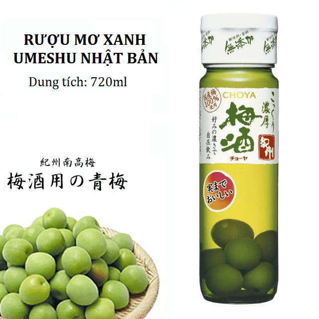Mơ xanh Choya là dòng sản phẩm thuộc thương hiệu lâu năm của Nhật Bản - Traditional Japanese UMESHU (Ume Fruit Liqueur), với những trái mơ Nhật được ngâm trong chai. Mơ xanh Choya có nồng độ nhẹ (14 độ), thơm mùi mơ, không chỉ mang tới sắc hồng cho đôi má mà còn giúp trao đổi máu, nhuận tràng, đẹp da.
