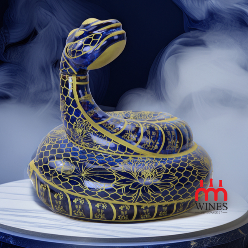 • Thiết kế thủ công tinh xảo: Vỏ chai được chế tác từ gốm sứ men hỏa biến cao cấp, bên ngoài phủ vàng lộng lẫy, tạo nên vẻ đẹp sang trọng và quý phái. Hình tượng con rắn được tạo hình uyển chuyển, tượng trưng cho sự bảo vệ và thịnh vượng.