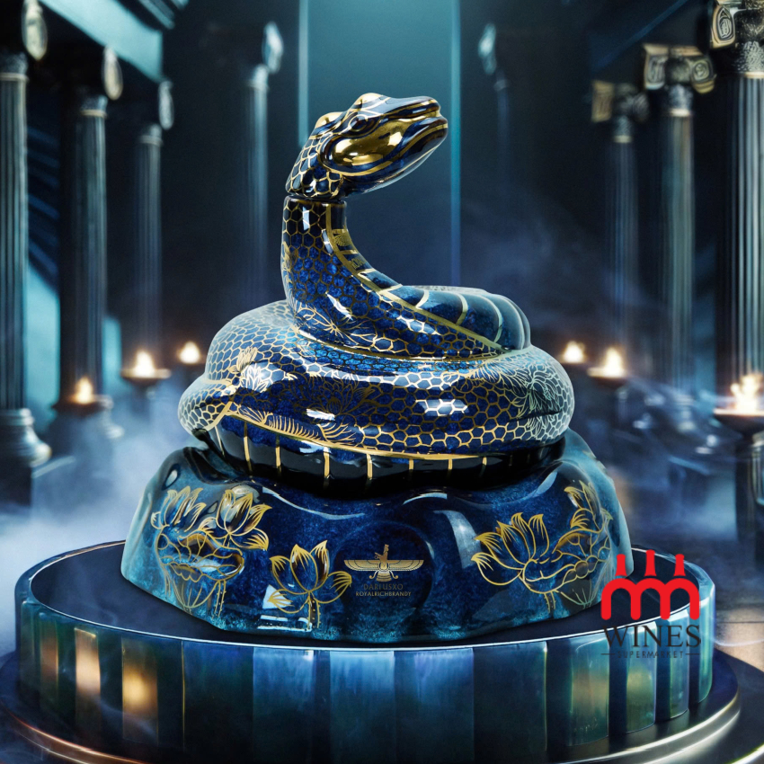 • Thiết kế thủ công tinh xảo: Vỏ chai được chế tác từ gốm sứ men hỏa biến cao cấp, bên ngoài phủ vàng lộng lẫy, tạo nên vẻ đẹp sang trọng và quý phái. Hình tượng con rắn được tạo hình uyển chuyển, tượng trưng cho sự bảo vệ và thịnh vượng.