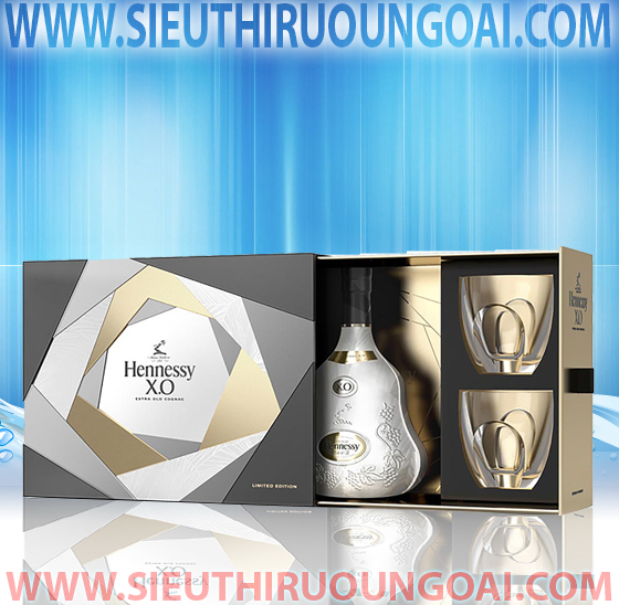 Hộp quà tặng gồm 1 chai Hennessy XO màu bạc sang trọng kèm 2 ly thủy tinh cao cấp.