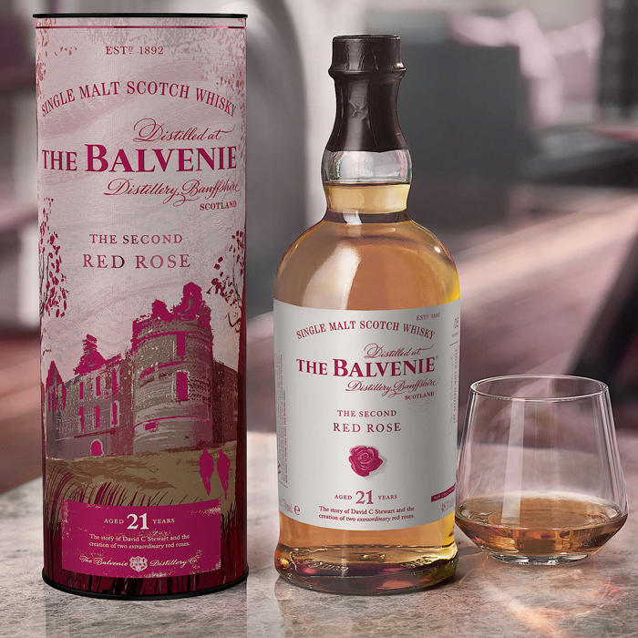 The Balvenie 21 Year Old Single Malt Scotch Whisky, The Second Red Rose, được ủ trong thùng shiraz của Úc và đóng chai ở mức 48,1% ABV. Đây là câu chuyện số 5 trong loạt Câu chuyện Balvenie.