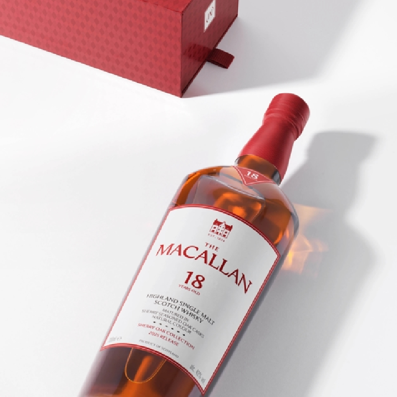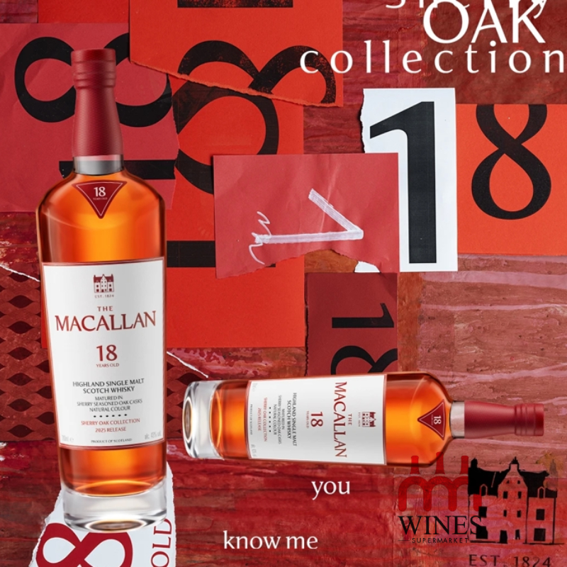 Phiên bản giới hạn hàng năm, The Macallan Sherry Oak 18 Years Old được ủ tối thiểu 18 năm tại The Macallan Estate trong những thùng gỗ sồi châu Âu chủ yếu được ủ sherry từ Jerez, Tây Ban Nha.