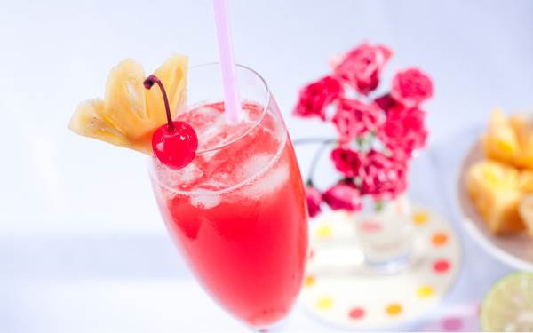 - Lắc mạnh và đều tay rồi rót ra ly. Gắn lát dứa và quả cherry lên miệng cốc.